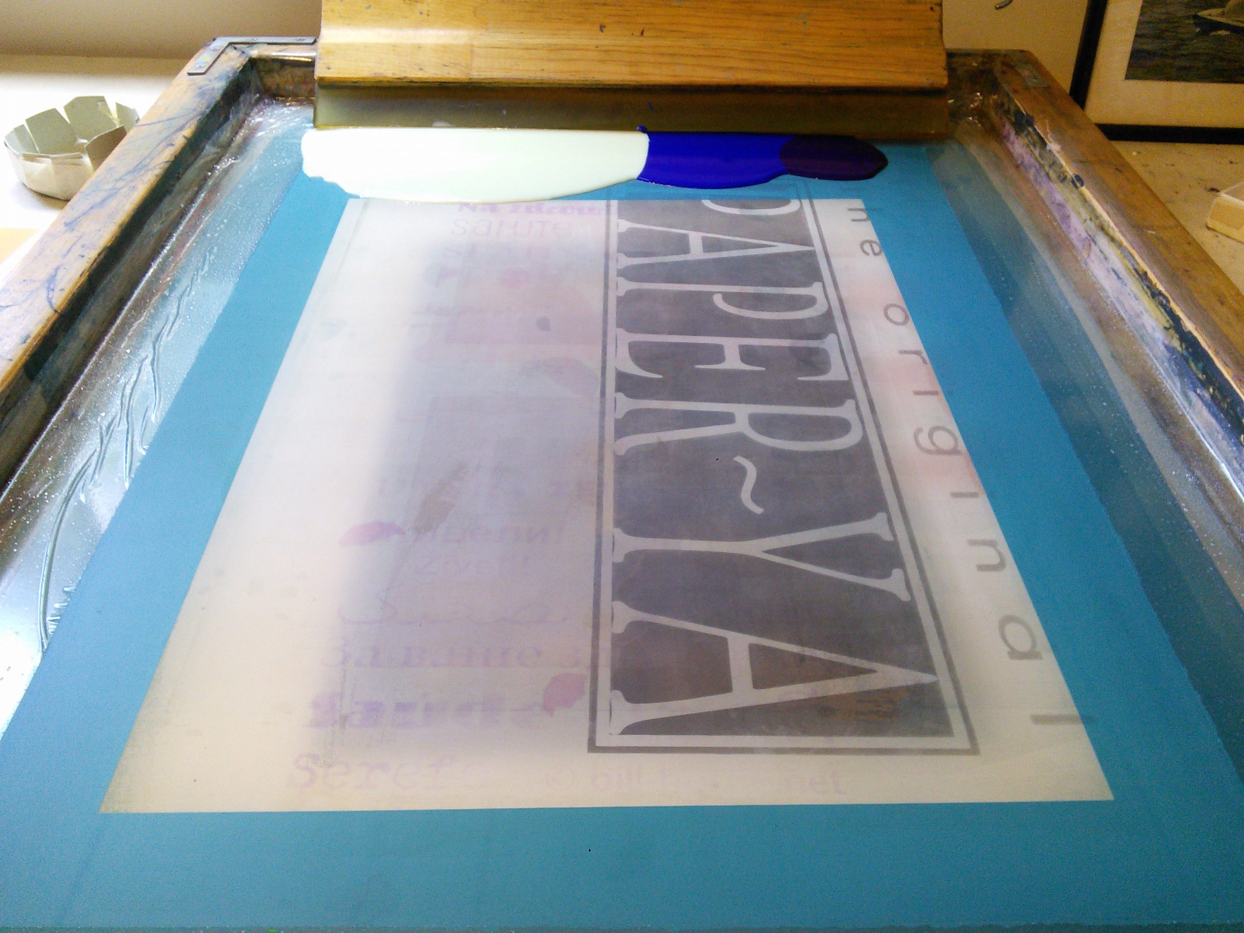 glow violet poured June 2017 ← Previous Next → Glow, ultramarine & violet ink on the screen (“Paper-Ya” is a “ghost image” from printing silk banners in 1996; doesn’t print).